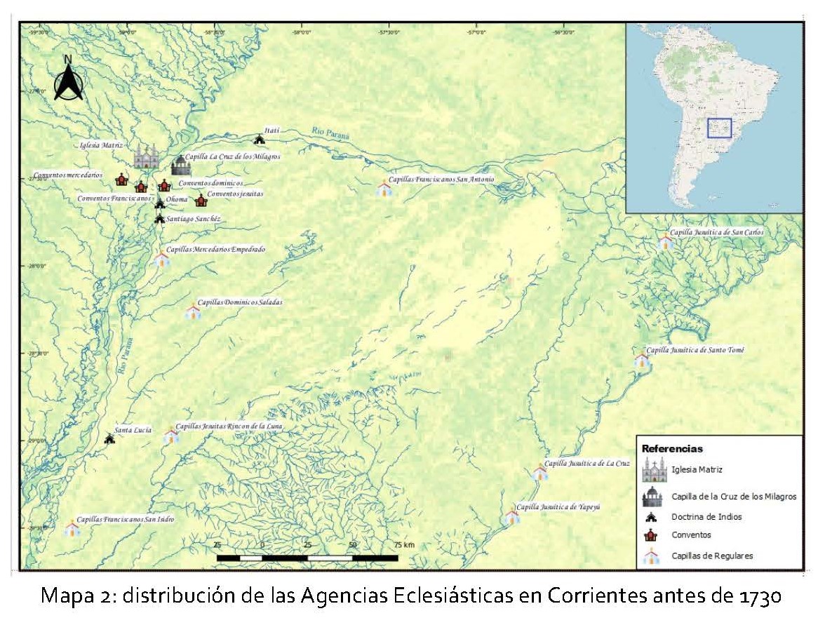 En este artículo, exploraremos el funcionamiento de la región eclesiástica configurada en el territorio de Corrientes, ciudad de la gobernación de Buenos Aires, desde la fundación en 1588 hasta 1810. Este análisis nos permitirá dar cuenta de la red de parroquias, oratorios e iglesias que se constituyeron tras las visitas pastorales y observar cómo las mismas dieron respuestas a los requerimientos de la población local. Más allá de un análisis institucional, nuestro objetivo es visualizar espacialmente cómo convivían agencias eclesiásticas múltiples (informales) y, verificar la permeabilidad y yuxtaposición de las jurisdicciones. De esa forma rastrearemos cómo las capillas u oratorios atendían a fieles, aunque no constituían formalmente una parroquia, y en ese contexto, cómo los franciscanos, mercedarios, jesuitas y dominicos colaboraban en satisfacer las demandas religiosas de la población.