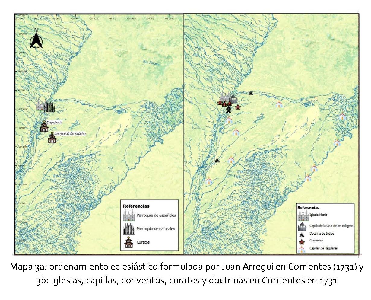 La creación de este primer curato rural representó el inicio de la diversificación de estructuras eclesiásticas en territorios de la campaña correntina, más allá del espacio controlado por la ciudad o los pueblos de indios. Como se observa en el mapa 3a16, las parroquias de San José de las Saladas y Empedrado eran las primeras parroquias de españoles instauradas en la jurisdicción correntina. En el mapa, no incluimos los dispositivos religiosos existentes en la jurisdicción, sino que solo identificamos las nuevas parroquias. En tanto en el mapa 3b, ubicamos cómo quedo estructurado el ordenamiento eclesiástico correntino hacia 1740. Muy cercanas a las parroquias de españoles de San José de las Saladas y Empedrado, se encontraban las capillas de regulares a cargo de jesuitas y franciscanos que pertenecían a los pueblos de indios como el caso de Santa Lucía de los Astos, Santiago Sánchez, Candelaria de Ohoma e Itatí y en el caso de los jesuitas, las capillas ubicadas en las estancias. Como se observa en el mapa 3b, se incluyen las iglesias emplazadas por Juan de Arregui y los dispositivos religiosos existentes en el espacio. En el caso de las capillas de regulares, no tuvieron cambios con la visita de Juan de Arregui por eso no la incluimos en el mapa 3a.