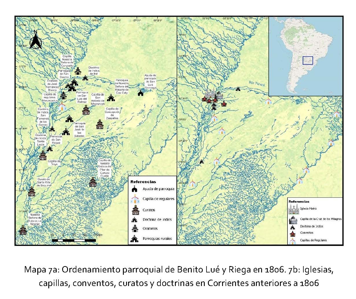 En el mapa 423, ubicamos el emplazamiento de la parroquia rural de San José de las Saladas y la ayuda de parroquia conocida como Nuestra Señora del Socorro de Caa caty, como fin de observar las disposiciones tomadas por el visitador. Las mismas se configuraron en los dos centros principales del área que se extendía entre los ríos Santa Lucía y Corrientes, constituidos a partir del poblamiento de la cuenca del Ibera entre 1750-1773 (Maeder, 1981-68). En el mapa 4b, incorporamos el mapa de la estructura eclesiástica conformada por iglesias, parroquias, capillas de todo el territorio correntino.