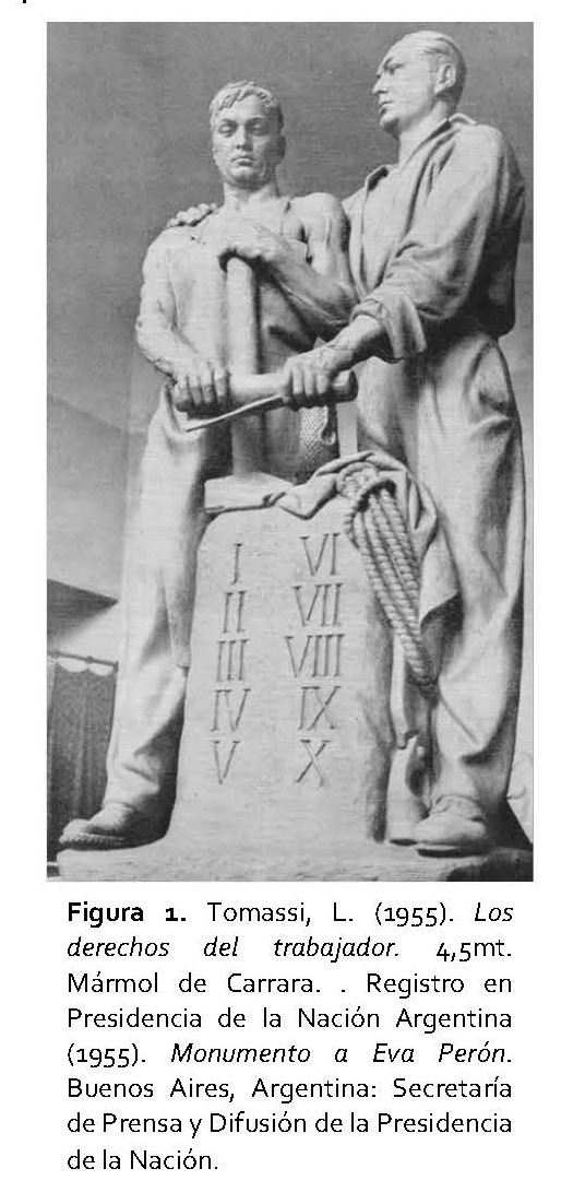 En lo siguiente procedo a realizar una actualización interpretativa de cuatro de las dieciséis esculturas proyectadas por el artista italiano Leone Tomassi para el peristilo exterior y el salón principal del Monumento al Descamisado/Monumento a Eva Perón. Se trata de esculturas de aproximadamente 4,5 metros de altura y 35 toneladas de peso, preparadas primero en arcilla y yeso en el atelier de la familia Barra en San Isidro, luego realizadas en mármol de Carrara en el propio taller del artista en Pietrasanta (Italia) (De Masi, 2009) y tituladas La independencia económica (1952), El amor (1952), La razón de mi vida (1953) y Los derechos del trabajador (1955).